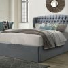 The Milan wingback bed comes with a slight curved top, supported by a deep buttoned headboard standing at 54″ high. The padded headboard is part of our chesterfield range that