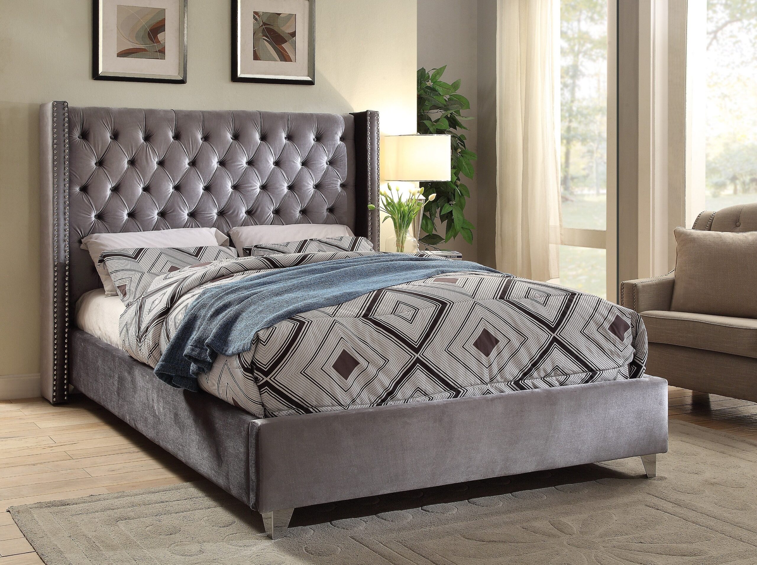 The Myrah wingback bed comes with a double beaded side, supported by a deep buttoned headboard standing at 54″ high. The padded headboard is part of our chesterfield range that